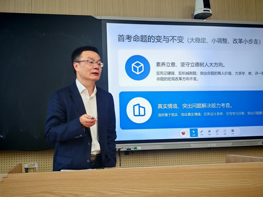 随后,浙江省派专家、省特级教师、正高级教师、杭州市基础教育教研室副主任、中学政治教研员杨志敏老师为大家带来了《基于2026首考的高中思想政治学科“考”“教”分析》的讲座。杨老师围绕2026年高中思想政治学科首考,从考试命题特点与教学实施策略等方面展开分析,为高中政治老师把握考试方向、优化教学方法提供了专业指导,助力学科“考”“教”精准衔接,提升教学与备考的有效性。