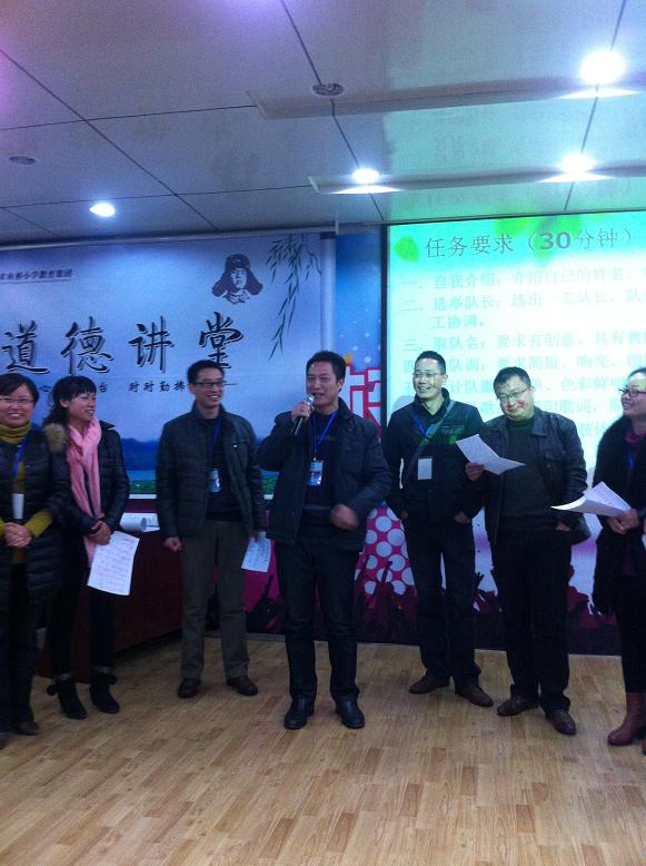 在12月2日上午的开班破冰活动中,学员表现出色,在短短的30分钟内,完成了组名、组歌、口号、图画等的设计和创作,“梦之翼”、“龙超队”、“合力队”、“巨鲸队“、非常6+5”等一个个响亮的队名、一首首学员自创的歌曲,结合江山市“135”课堂教学模式,充分展示了教师的教育激情和教育梦想,受到了资深心理咨询专家谢需教授的好评。