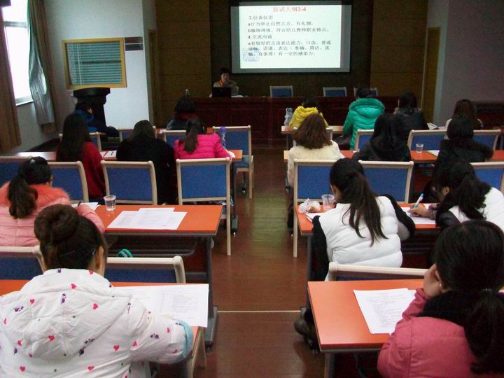 12月22日是嵊州市未取得幼儿园教师资格在岗幼儿教师为期9天的阶段性培训的最后一天,在市教师进修学校的两个多媒体教室里近60位即将参加今年下半年幼儿园教师资格证国考面试的在岗幼儿教师在两位幼教专家的面授机宜下进行最后的复习冲刺。