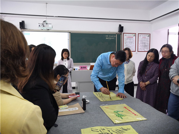 长兴县书法家协会主席张志敏先在《汲取与演绎》的专题讲座中,为全体学员讲解了书法常识与书法欣赏等理论知识,在实践指导环节中,张老师针对学员书法基础参差不齐的现状,为大家范写作品,并循循善诱地进行个别指导。